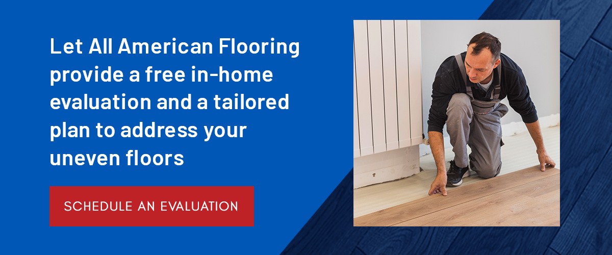 At All American Flooring, we’ve been helping Dallas-Fort Worth homeowners with flooring challenges since 1989. Our team can provide a free in-home evaluation to give you precise answers and a tailored plan for fixing your uneven floors. Schedule it online or visit your nearest showroom to talk in person.